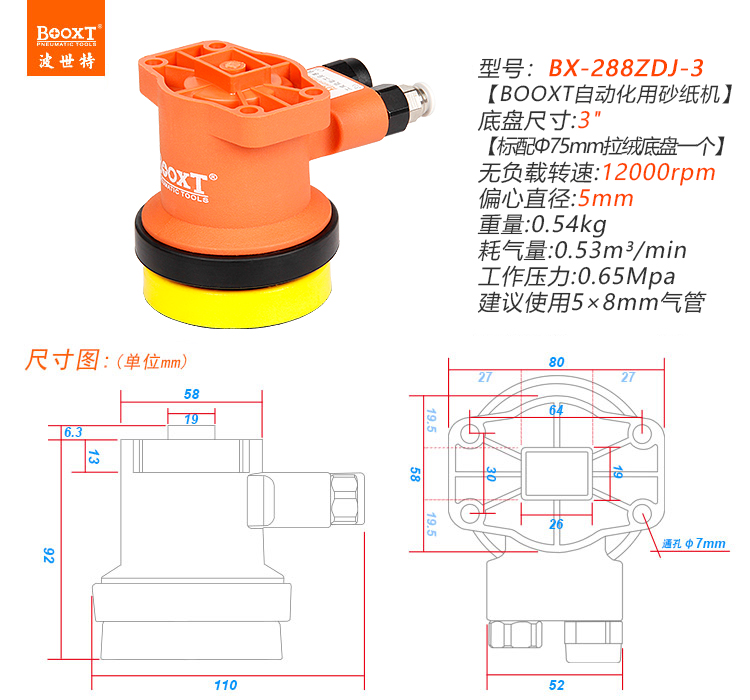 • 產(chǎn)品參數(shù): 底盤尺寸:75mm 【3寸】 偏心尺寸:5mm 空載轉(zhuǎn)速:12000rpm 工具全長:110mm 重 量:0.54KG 耗 氣 量:0.53m3/min