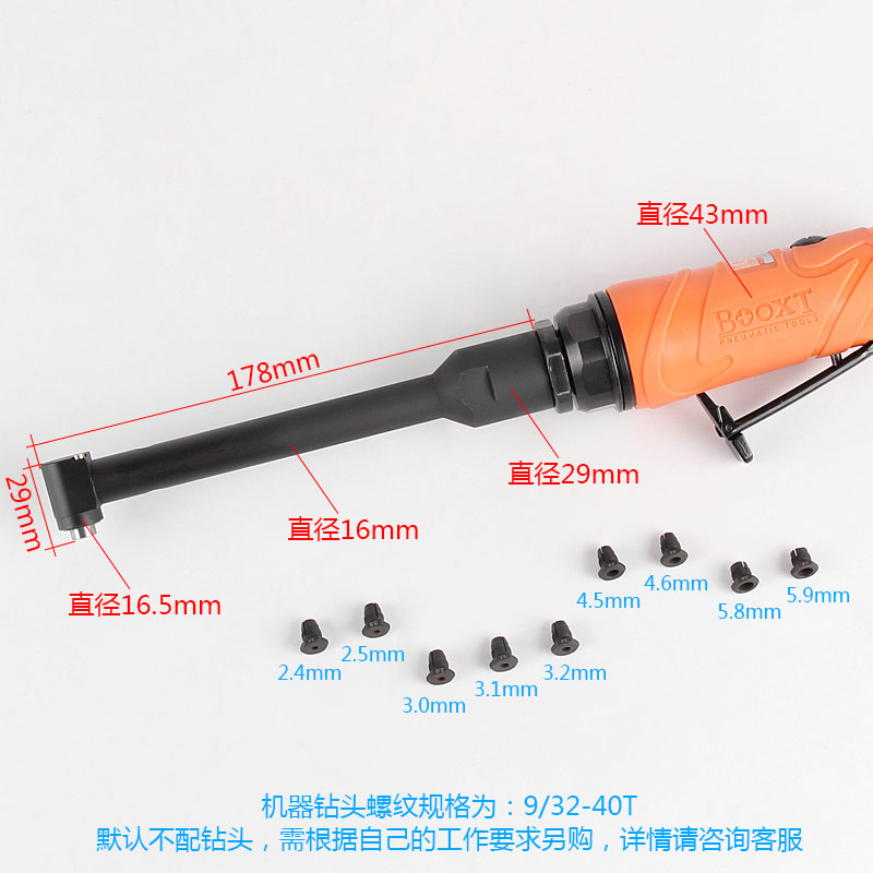 • 產(chǎn)品參數(shù): 夾頭螺牙:9/32"*40T 空載轉(zhuǎn)速:3600rpm 馬達功率:0.5HP 全 長:335mm 重 量:0.96kg 耗 氣 量:99L/min(加長型)