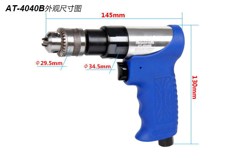 • 產(chǎn)品參數(shù): 夾頭尺寸:1.0-6.5mm 【1/4"】 馬達(dá)功率:0.3hp 空載轉(zhuǎn)速:2800rpm 全 長(zhǎng):145mm 重 量:0.70kg 耗 氣 量:0.5m3/min 【單向設(shè)計(jì)/工業(yè)型】