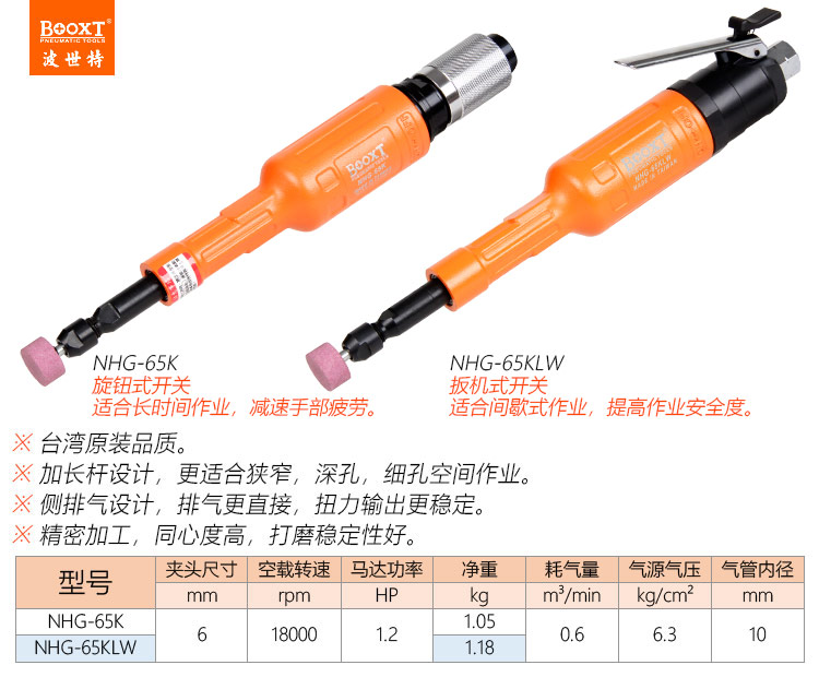 東莞市強(qiáng)勁五金工具有限公司提供臺(tái)灣BOOXT波世特品牌氣動(dòng)工具,加長(zhǎng)氣動(dòng)磨頭機(jī)NHG-65K廠家直銷,首件享特價(jià)。咨詢熱線:4008301980