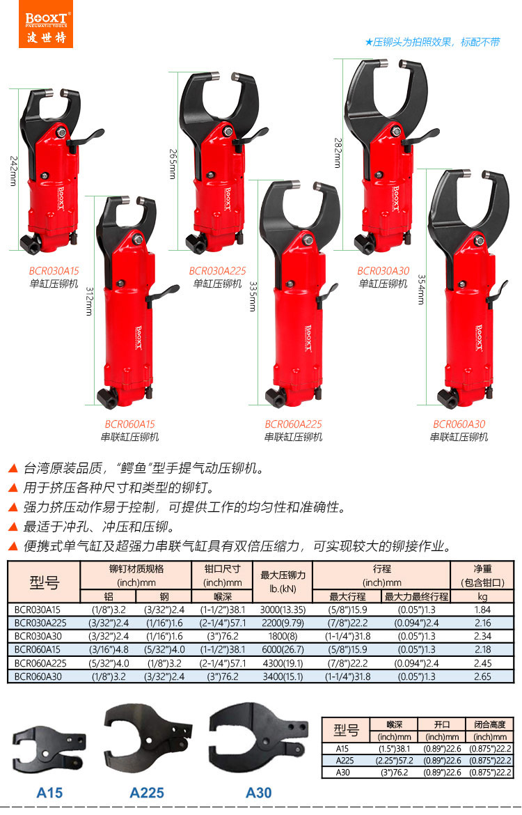 東莞市強勁五金工具有限公司提供臺灣BOOXT波世特品牌氣動工具,鱷魚口氣動壓鉚鉗機BCR030A30廠家直銷,首件享特價。咨詢熱線:4008301980