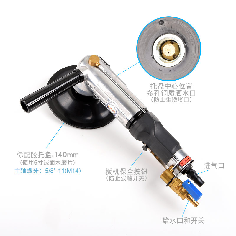 • 產(chǎn)品參數(shù): 托盤尺寸:140mm(M14螺牙);使用磨片:140mm或150mm;轉(zhuǎn)速:11000rpm;長度:300mm;重量:2.0kg;功率:0.61hp;耗氣量:0.46立方米/分鐘;使用工作氣壓:0.63Mpa;推薦氣管內(nèi)徑8mm;平時(shí)使用應(yīng)多加氣動(dòng)油保養(yǎng)